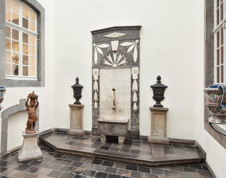 De binnenplaats verbindt het voor- en achterhuis met elkaar. Ze kreeg in de jaren ’50 een blauwe hardstenen vloer en een glazen dak. De fontein aan de brandmuur naar het naburige huis heeft een marmeren omranding uit de late 18e eeuw. Drie halve manen, het wapen van de familie Monheim, zijn te herkennen op het bekken. Aan de oostkant van de binnenplaats kondigen kozijnen het souterrain van het achterhuis aan. Een trap leidt naar de historische keuken in huis “Zur Waage” en het achterhuis. De huizen waren toen nog gescheiden. Na 1833 was in het achterhuis vermoedelijk de farmaceutische groothandel van Johann Peter Joseph Monheim ondergebracht.