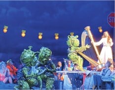 Abb.: Bühnenfoto der drei Aliens aus der Oper „Il Viaggio a Reims“, Darstellende: Statisten. (Foto: Theater Aachen)