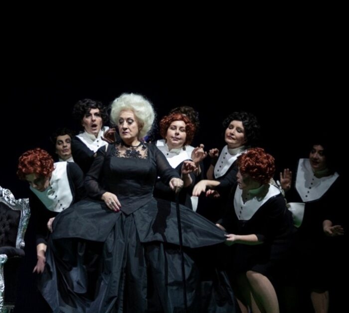 „Pique Dame“ ist eine große Oper – es gibt viele verschiedene Rollen und das bedeutet: viele Kostüme. In dieser Inszenierung hatten einige Chorsängerinnen sieben Kostümwechsel; allein für den Damenchor wurden 117 Kostüme gefertigt. Andreas Becker, der von allen geschätzte Bühnen- und Kostümbildner, ist bekannt für seine Liebe zu Details. Gemeinsam haben wir versucht, mit so wenig Aufwand wie möglich ein überzeugendes Ergebnis zu erzielen. Für die Chorkostüme der Dienstmädchen bedeutete das: Wir griffen auf jene Chorkleider zurück, die bei allgemeinen Chorauftritten jeder Dame des Chores zur Verfügung stehen, und bauten darauf auf. An dem Standard-Chorkostüm wurden ein weißer Krageneinsatz und eine Schleifenpartie am Rücken ergänzt. Für die Schleifen verwendeten wir stabilen Wollfilz – ein wunderbares Material, das sich immer wieder als Grundlage für unterschiedlichste Materialverfremdungen eignet. Der Filz lässt sich einfach zuschneiden und muss nicht gesäumt werden. Außerdem lässt er sich gut bemalen – was wir in diesem Fall mit schwarzer Farbe taten, um die Plastizität der Schleifen zu betonen. Ganz einfach – mit großer Bühnenwirkung!