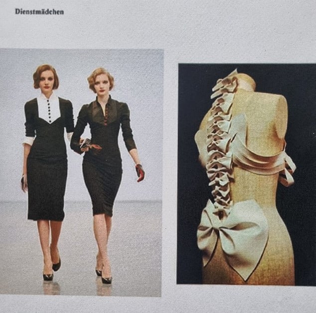 Abb.: Entwurfscollage für die Dienstmädchenkostüme und Bühnenfoto von den Chordamen im Dienstmädchenkostüm (Foto: Theater Aachen)